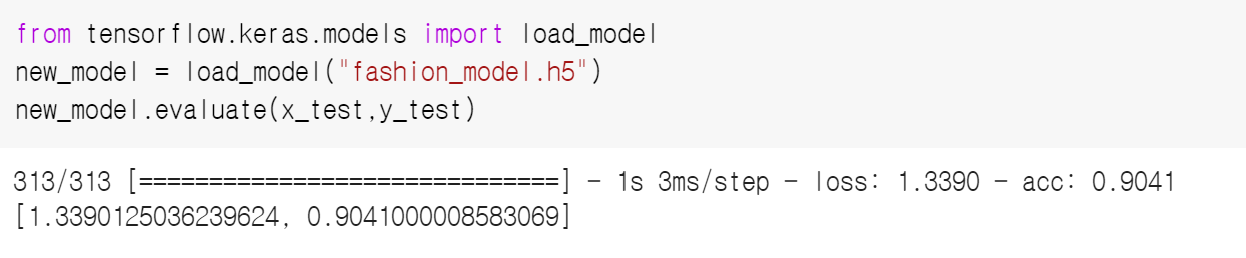 문제85. 저장한 모델인 fashion_model.h5를 불러와서 신경망을 구성한 후 테스트 데이터의 정확도를 확인하시오.