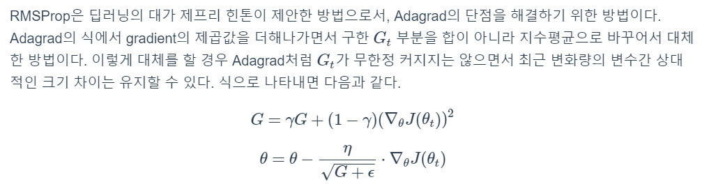 3. RMSprop : Adagrade의 장점을 더 좋게 만든 경사하강법. 발걸음이 자동조절되는데 목표지점에 도달할 때 이전에 내려오던 그 걸음걸이를 살펴서 발걸음을 조절함.