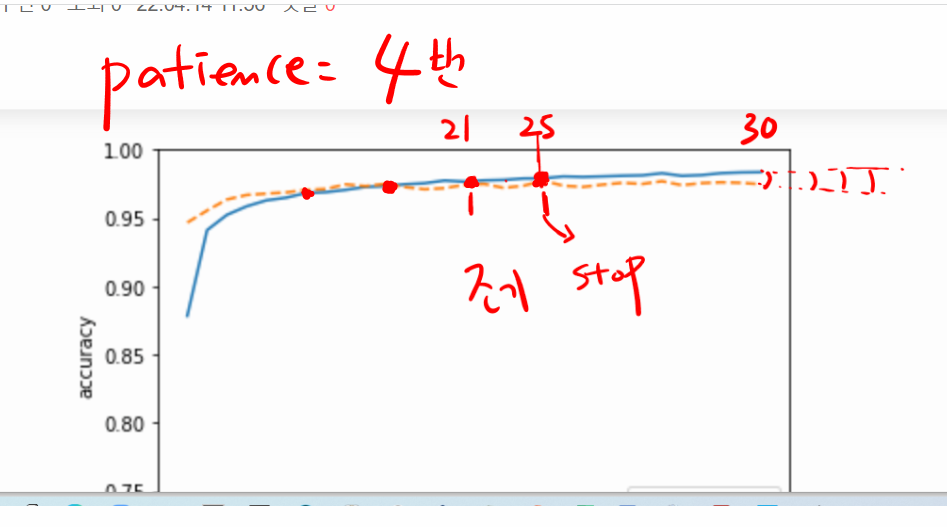 -> 훈련데이터와 테스트 데이터의 정확도가 비슷해지거나 테스트데이터의 정확도가 훈련 데이터의 정확도를 역전하는 그 시점에서 학습을 멈추겠다 -> early stop