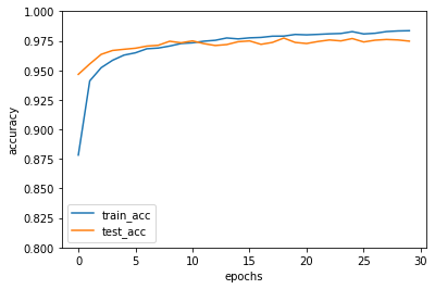 print(f'훈련데이터 정확도 : {train_acc_list[-1]}, 테스트데이터 정확도 : {test_acc_list[-1]} ')