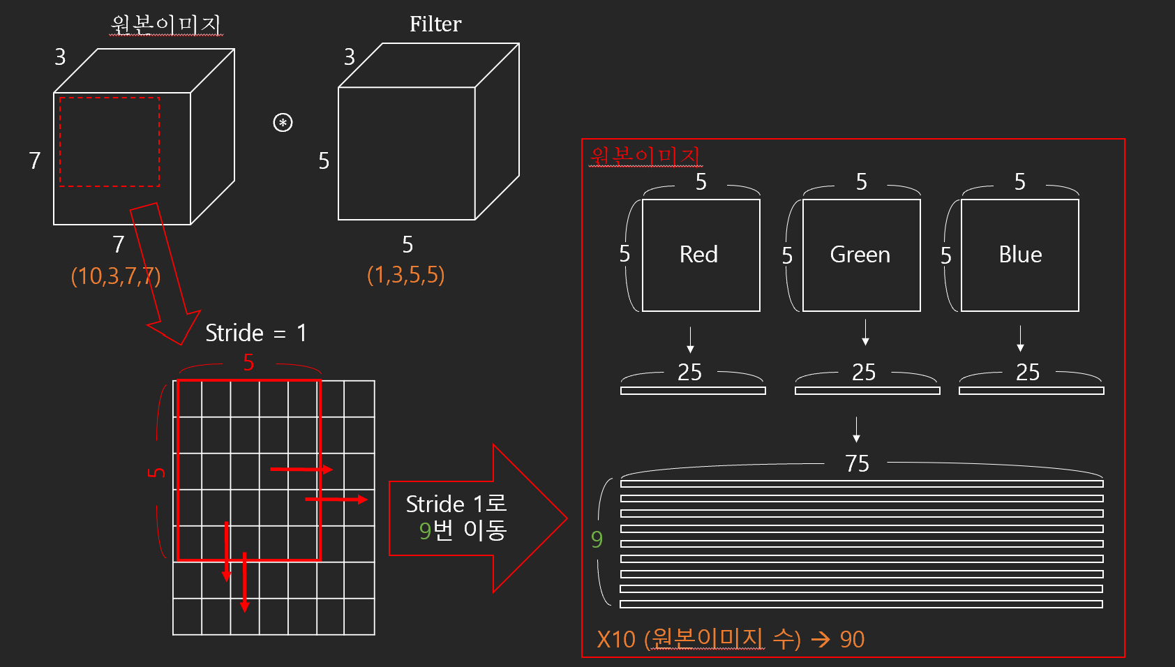 (10,3,7,7)을 필터(1,3,5,5)에 맞춰 2차원으로 바꾸면 (90,75)가 됨