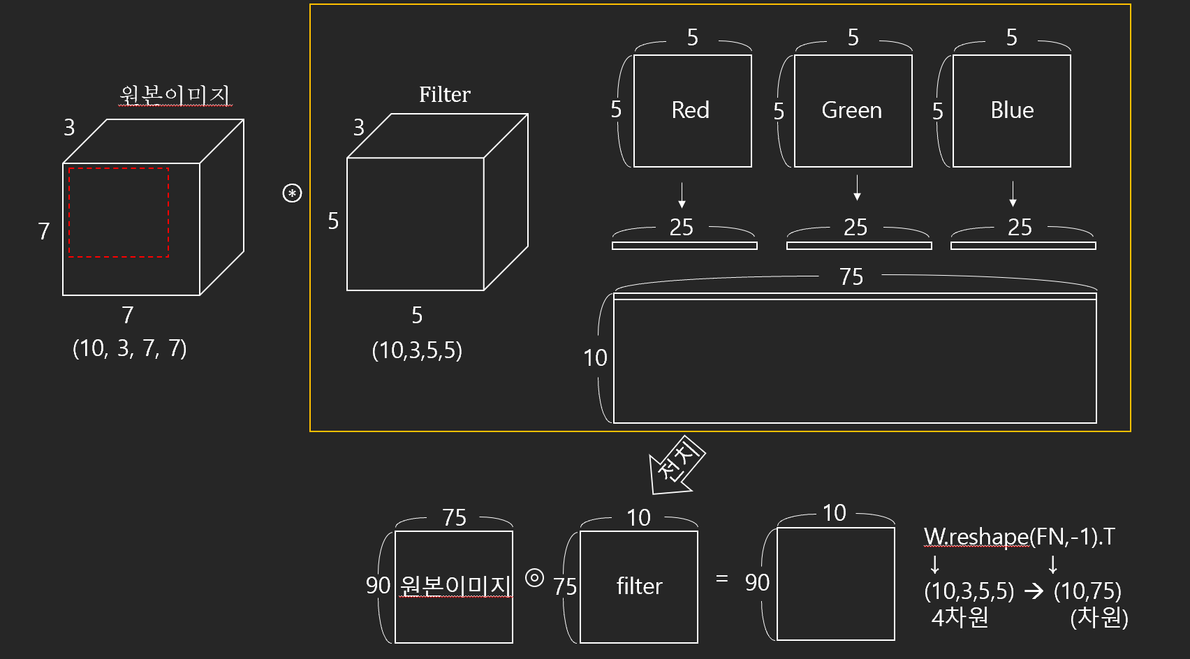 필터이미지 : (10, 3, 5, 5) ---> (10,75) : reshape로 변환