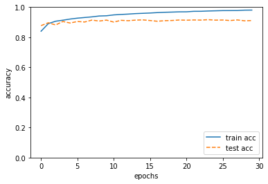 훈련 데이터의 정확도는 96에서 98로 올라갔고 테스트도 90에서 91로 올라갔음. 하지만 아직도 오버피팅이 발생함.
