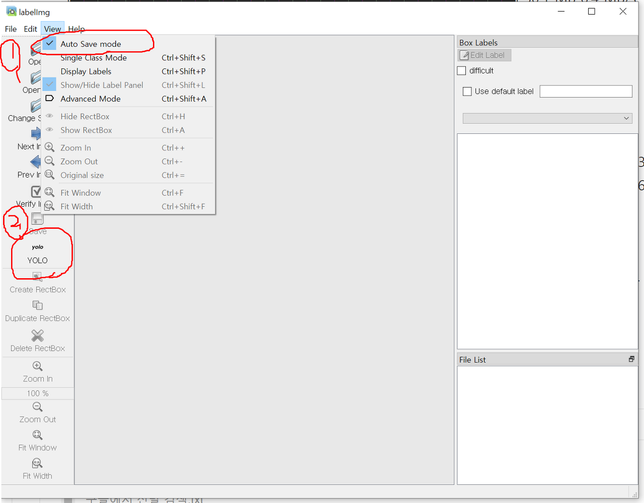labelImag 프로그램을 열고 View 에 Auto save mode 를 누룹니다. 그리고 아래에 2번 처럼 yolo 로 변경합니다.