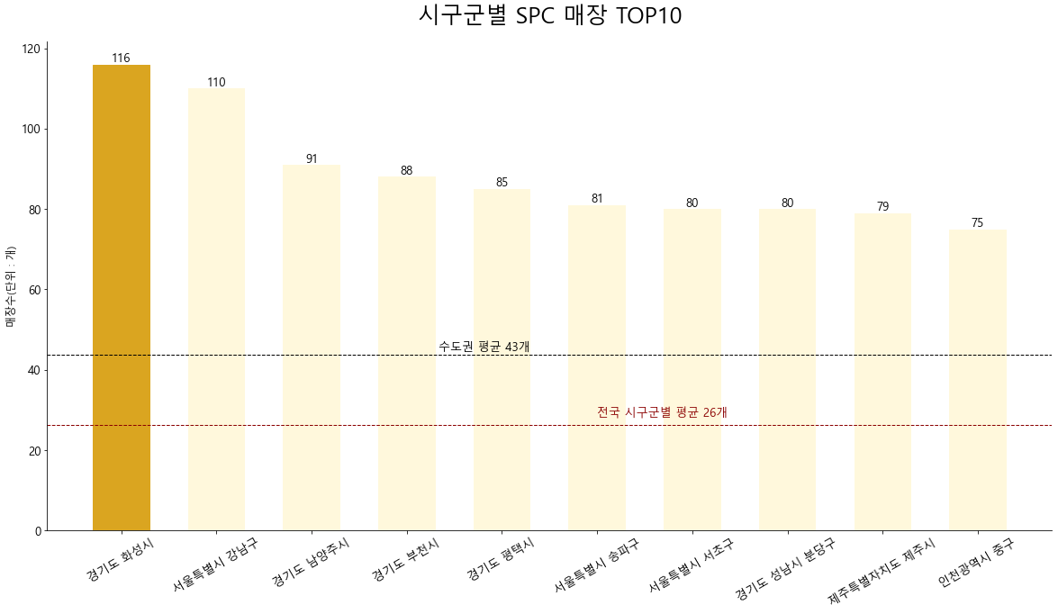 시구군별 spc매장이 많은 도시 top10을 보면 경기도 화성시가 116개로 가장 많고 그 다음으로 서울특별시 강남구(110개), 경기도 남양주시(91개), 경기도 부천시(88개), 경기도 평택시(85개), 서울특별시 송파구(81개), 서울특별시 서초구(80개), 경기도 성남시 분당구(80개), 제주특별자치도 제주시(79개), 인청광역시 중구(75개) 순이다. top10중 서울이 3곳, 제주시를 제외하고는 9곳이 모두 수도권 도시다. 매장수 100개 이상인 곳은 경기도 화성시와 서울특별시 강남구 2곳 뿐이며 특히 경기도 화성시는 전국 시구군별 평균(26개)보다 약 4.5배 이상 매장이 많다. 또 수도권 전체 평균은 43개로 전국 시구군별 평균(26개)보다 약 1.5배 이상 많은 편이다.