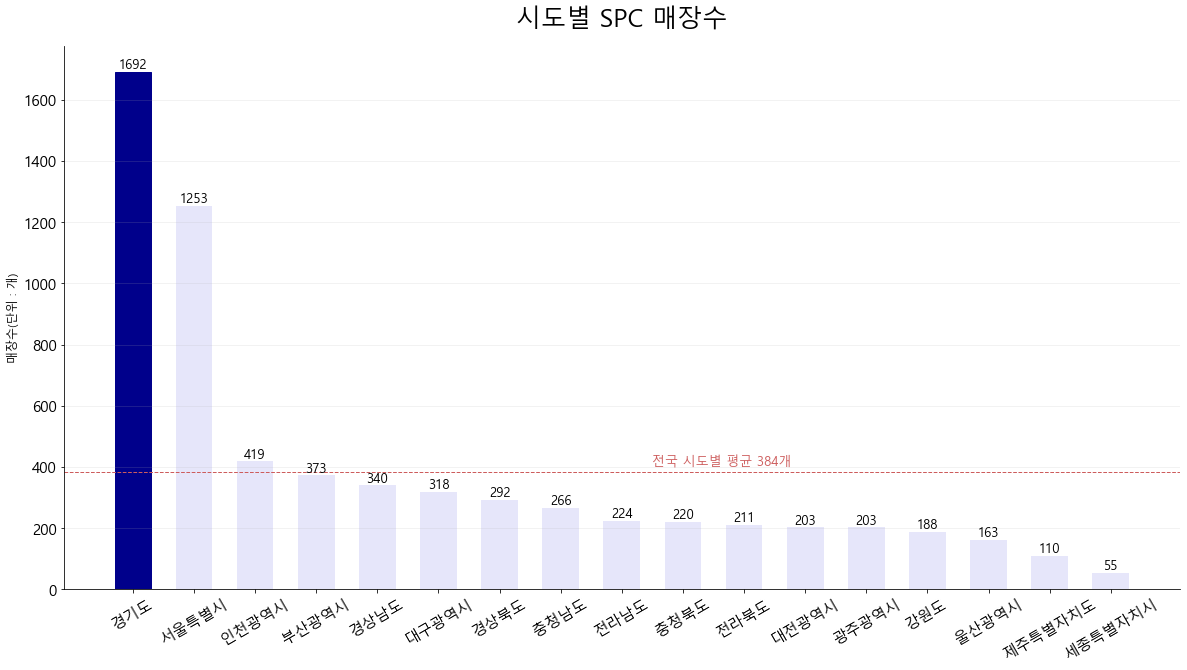 앞서 시도별 매장이 가장 많은 곳은 경기도, 서울특별시, 인천광역시 순이었다. 이 3곳은 시도별 매장수 평균(384개)보다 많은 곳들로 특히 경기도는 평균보다 약 4배 이상 많다. 매장수가 가장 적은 세종특별시와 비교해보면 31배, 제주특별자치도보다 15배 차이가 나는 걸 알 수 있다.