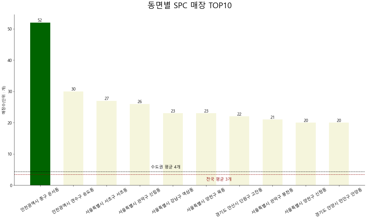 동면별 매장이 가장 많은 동네 top10은 인천광역시 중구 운서동이 52개로 가장 많다. 전국 평균 3개, 수도권 평균 4개에 비해 10배 이상 많은 편인데 이는 운서동에 위치한 인천공항에 많은 매장, 키오스크들이 운영중이기 때문인 것으로 보인다. 인천공항 내 입점한 spc브랜드는 던킨(8), 라그릴리아(2), 리나스(2), 배스킨라빈스(3), 빚은(4), 쉐이크쉑(1),스트릿(2), 잠바주스(7), 커피앳웍스(5), 파리바게뜨(4), 파리크라상(3), 파스쿠찌(4)로 총 12개 브랜드 45개의 매장이 있다.